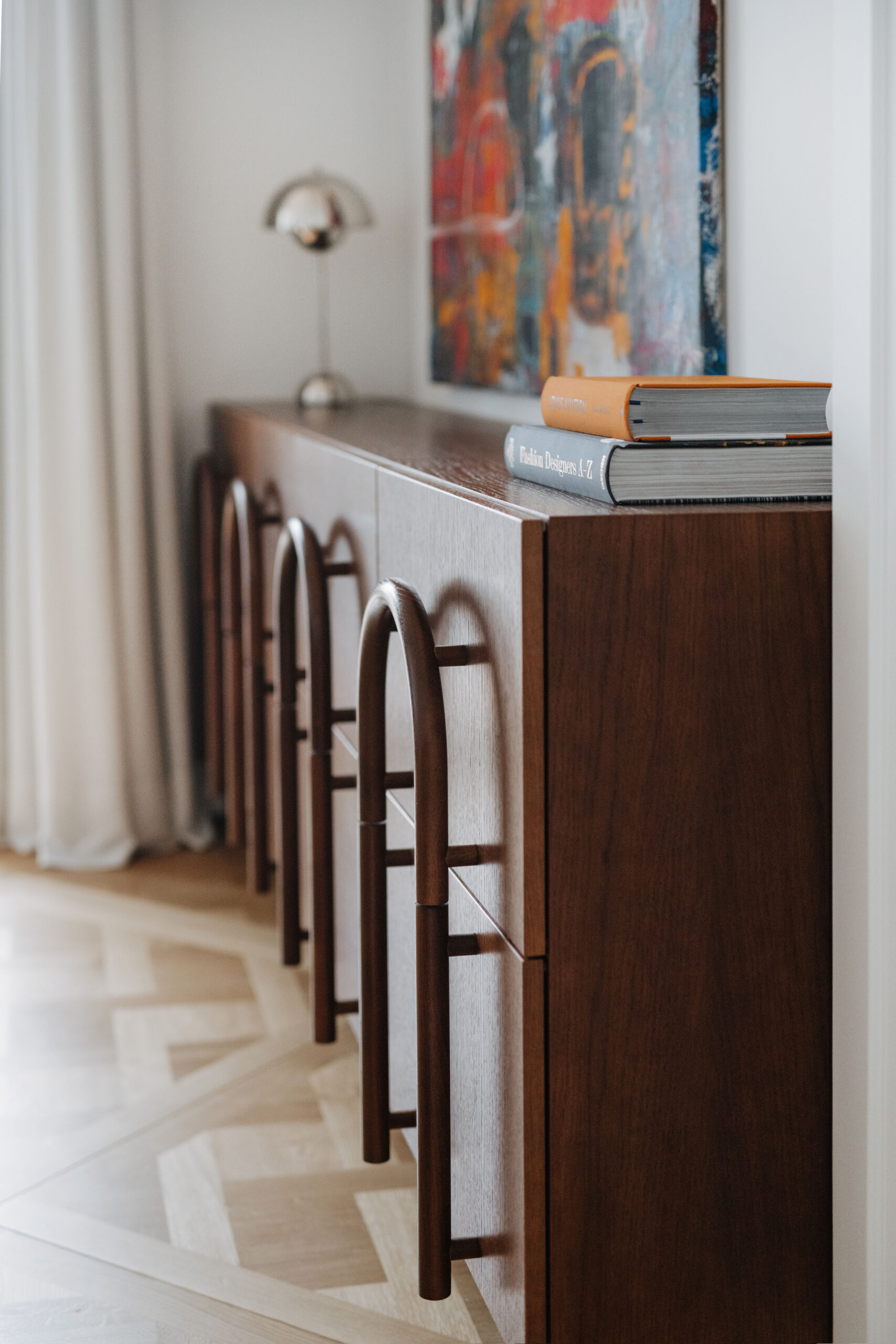 Taip pat mūsų erdvėje galite pamatyti ant žemės pastatomą 1930-aisiais sukurtą šviestuvą, įkūnijantį modernias idėjas ir tik įrodantį, kad geras dizainas savo kelią matuoja šviesmečiais. Dar namus puošia visiems puikiai žinomas Vernerio Pantono „Flowerpot“ stalinis šviestuvas, kurį galima padėtį į bet kurią namų vietą ir jis tiesiog skleis septyniasdešimtųjų žinutę. O tai, kad žavimės „Fritz Hansen“ kūryba, tiesiog akivaizdu – visi valgomosios zonos objektai nukelia į to laikmečio nuotaiką.