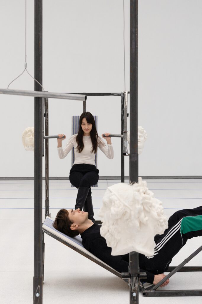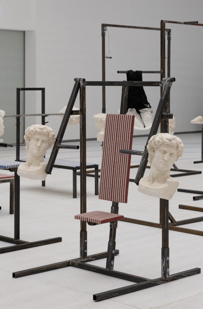 Augustas: Šis mano kūrinys atsigręžia į Vakarų kultūros ištakas – senovės Graikiją ir iš jos daug ką perėmusią Romos imperiją. Idealaus, raumeningo kūno vaizdinys ateina būtent iš ten ir mus pasiekia per graikų ir romėnų skulptūras. Šių skulptūrų kopijos yra naudojamos kaip modeliai klasikinėje meno edukacijoje, kurios pagrindą sudaro kopijavimas iš natūros. Savo kūrinyje svarmenų kilnojimą aš sugretinu su piešimu – abu procesai reikalauja nuolatinio įgūdžių tobulinimo, abu jie paremti tam tikrų veiksmų kartojimu. Taigi mano sukurti treniruokliai gali būti naudojami tiek sportui, tiek piešimui.